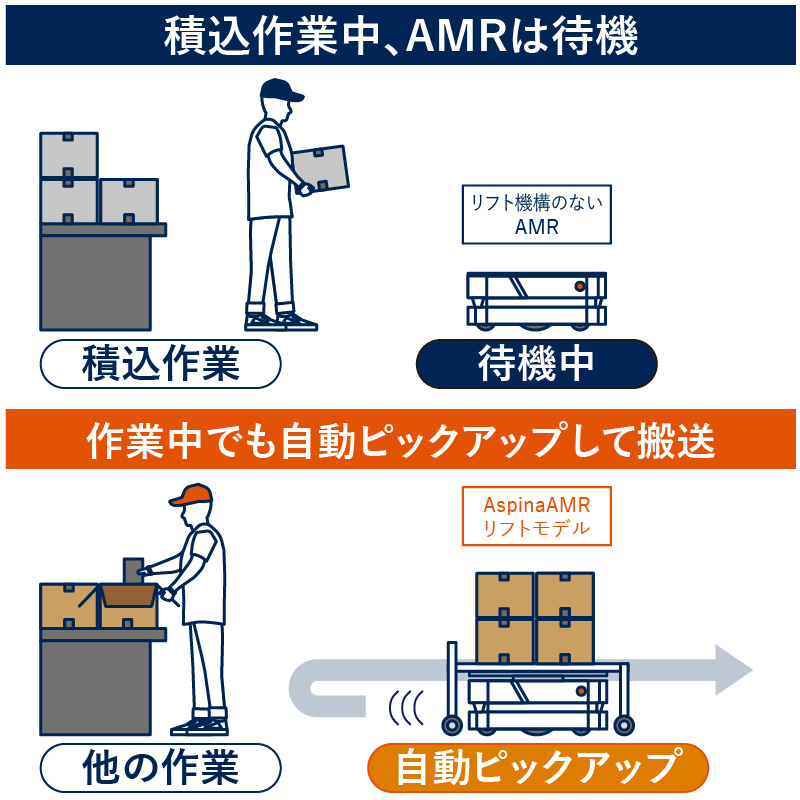 リフト機構のないAMRは、例えば部品や製品の工場内搬送では、AMRが到着していないと積み込めません。つまりAMR視点で見ると先着して「待機」する時間が必要です。さらに積込作業、荷下ろし作業中も「待機時間」となり、これらの時間AMRは搬送作業に従事できません。